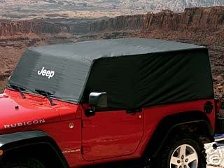 You are buying one new 2007-2012 Jeep Wrangler 2 door cab cover. This black water resistant high quality nylon cap in black fits snugly over your Wranglers hard or soft top. It eleminates the need to have to put up the whole top or the need to put on the hard top if the weatherman says it is going to rain, quick and easy! Great protection for any type of climate. Elastic loops attach around the tailights and mirrors, and includes two integrated cords that attach to the Jeep to secure the cover under the door area. When not in use simply fold it into the small snap closure storage bag. A genuine Mopar part with the Jeep logo.